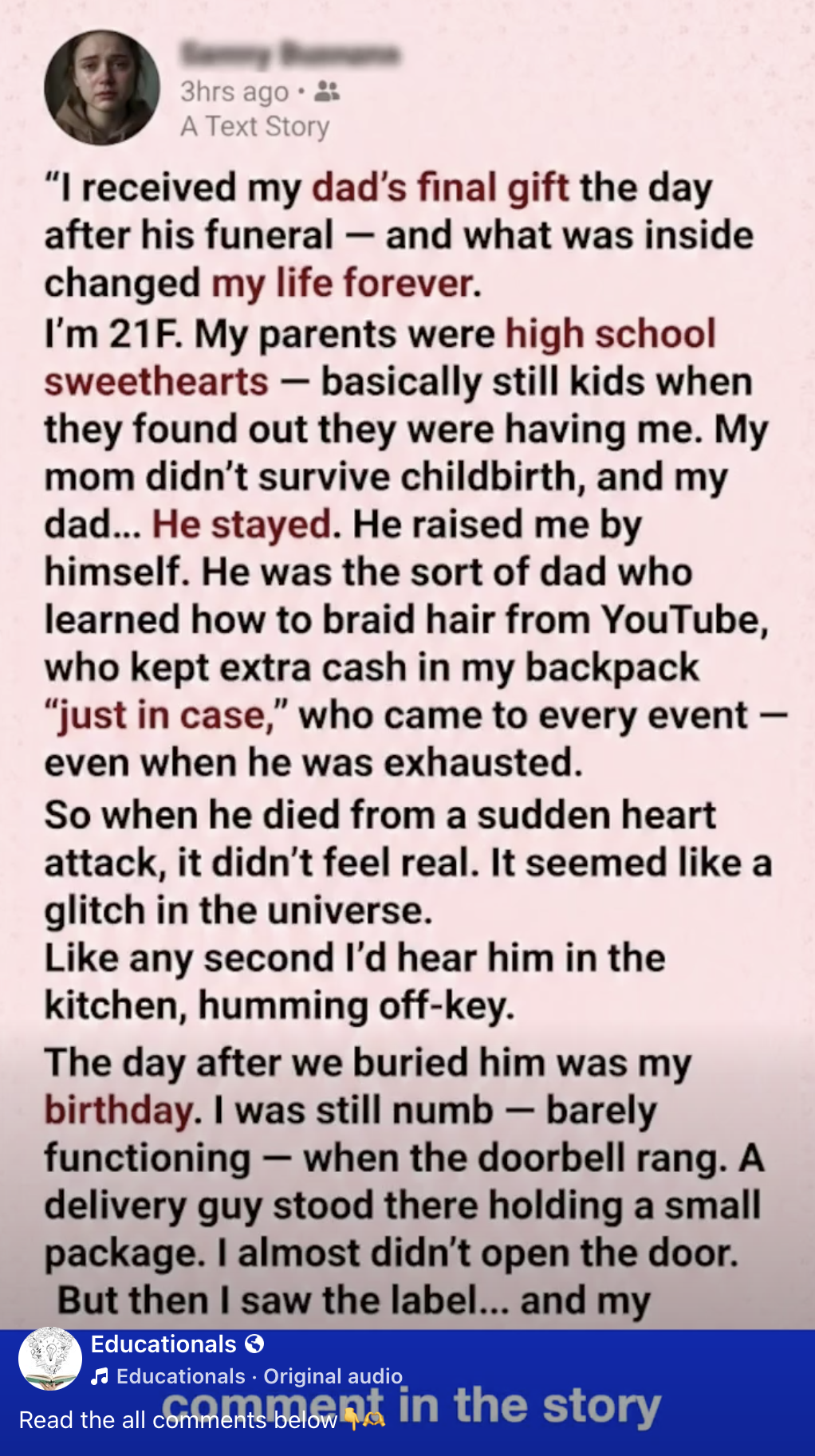 “I received my dad’s final gift the day after his funeral — and what was inside changed my life forever. I’m 21F. My parents were high school sweethearts — basically still kids when they found out they were having me. My mom didn’t survive childbirth, and my dad… He stayed. He raised me by himself. He was the sort of dad who learned how to braid hair from YouTube, who kept extra cash in my backpack “just in case,” who came to every event — even when he was exhausted.