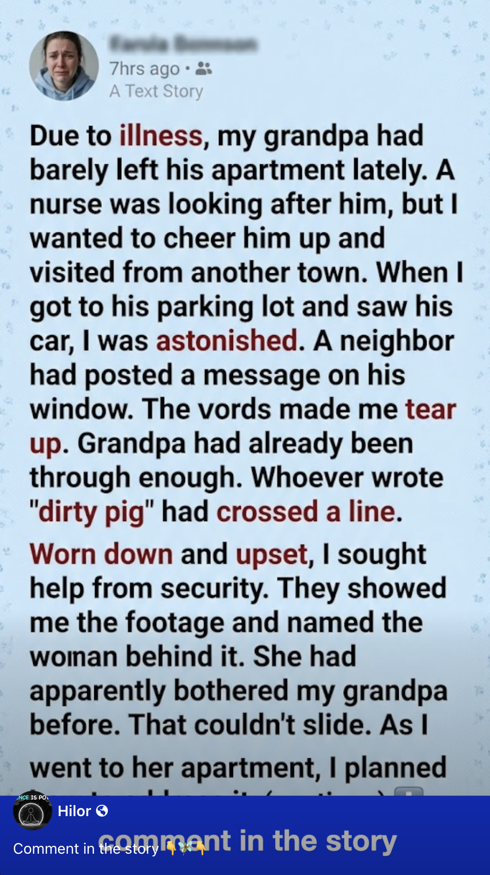 Due to illness, my grandpa had barely left his apartment lately. A nurse was looking after him, but I wanted to cheer him up and visited from another town. When I got to his parking lot and saw his car, I was astonished. A neighbor had posted a message on his window. The words made me tear up. Grandpa had already been through enough. Whoever wrote “dirty pig” had crossed a line.