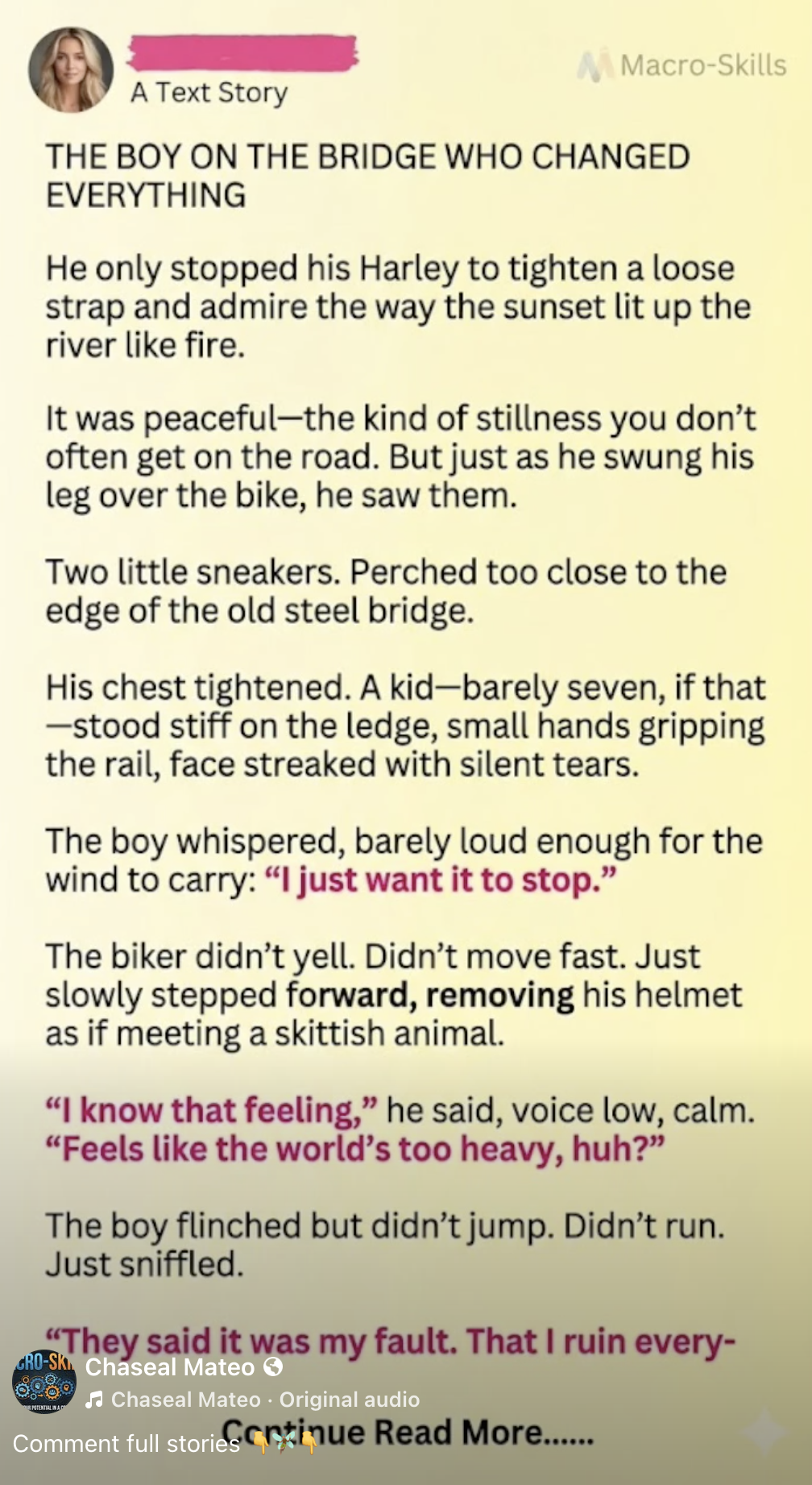 Twenty years later, Miller, now an old man, received a letter. It was from a trauma counselor who worked with at-risk youth. It was signed, “The Kid on the Bridge,” and enclosed was a photo of a man sitting on his own Harley, happy and alive.