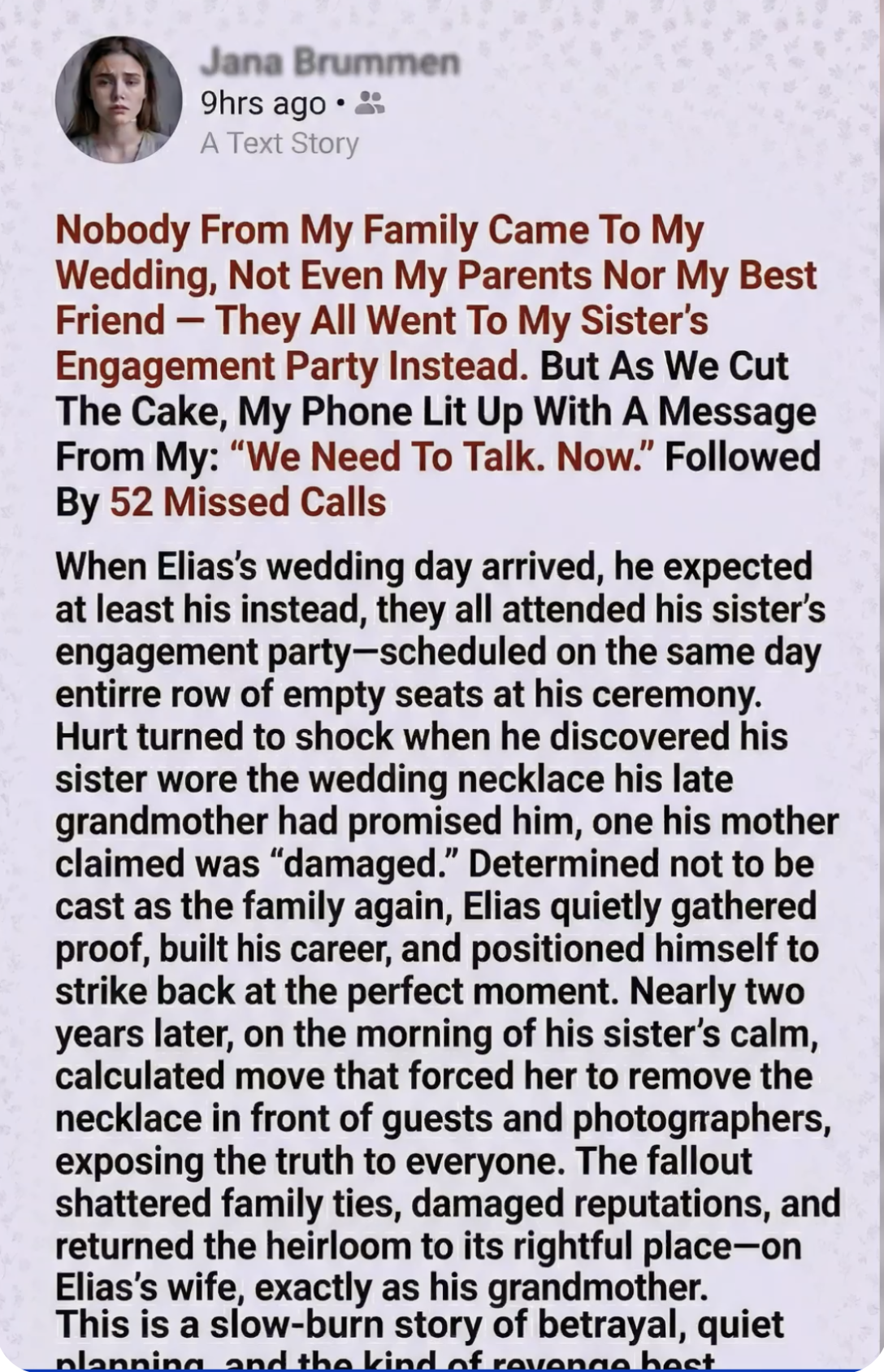 Earlier that morning, his mother had sent a single text: “Sienna’s engagement party is a once-in-a-lifetime event. You can get married any day. Don’t be selfish.”