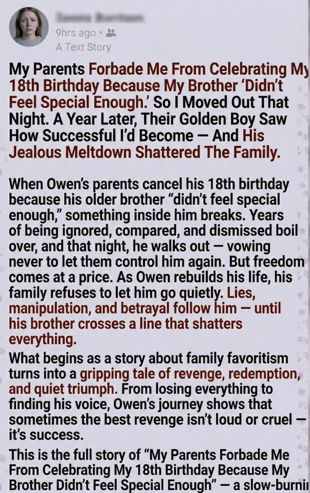 The Conflict: On the eve of his 18th birthday—a major milestone—Owen’s parents cancel his celebration. The reason? His older brother, the “Golden Boy,” felt jealous that the attention wouldn’t be on him.