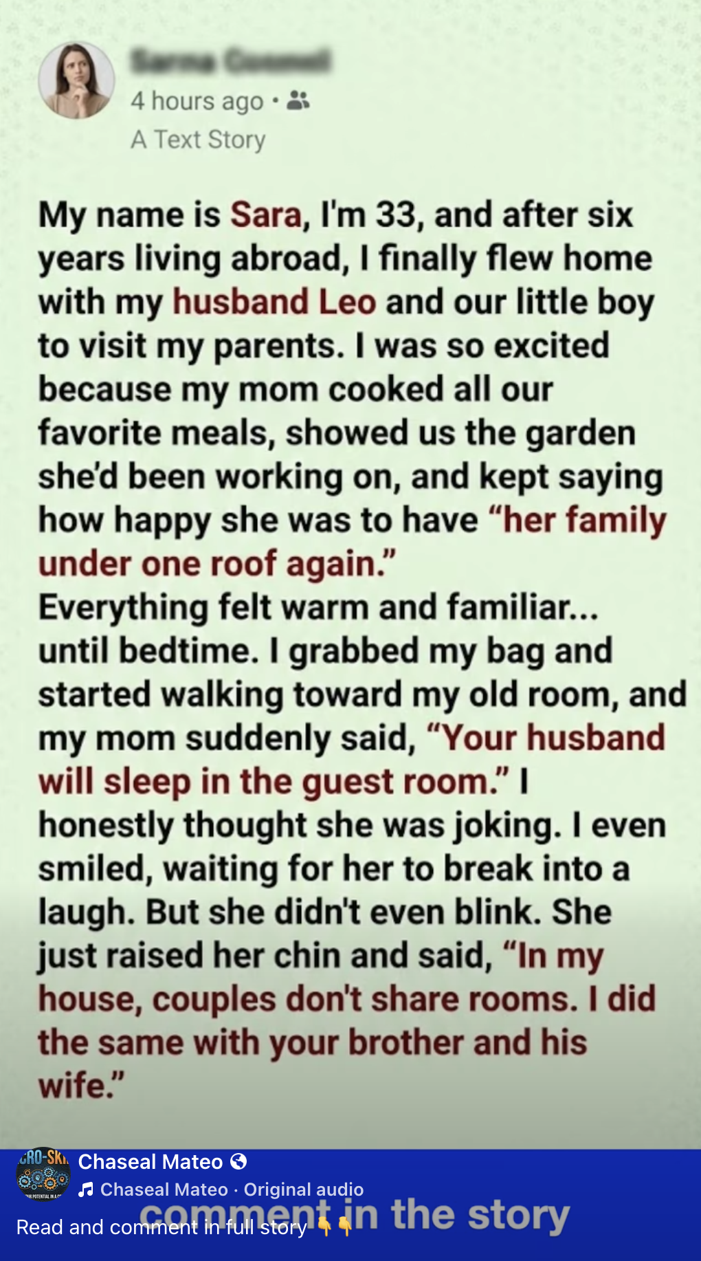 My name is Sara, I’m 33, and after six years living abroad, I finally flew home with my husband Leo and our little boy to visit my parents. It was supposed to be a heartwarming reunion. I was so excited because my mom cooked all our favorite meals, showed us the garden she’d been working on, and kept saying how happy she was to have “her family under one roof again.”