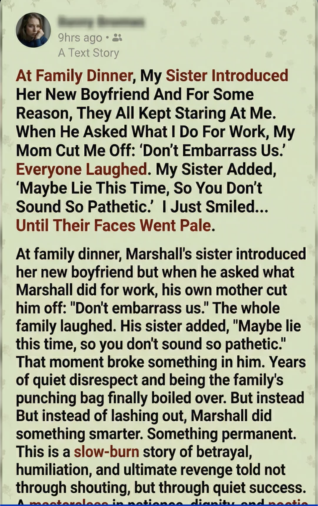 The porcelain clicked as my mother set her wine glass down, her eyes sharp and dismissive. “Don’t embarrass us,” she snapped before I could even open my mouth. My sister, Sarah, leaned over to her new boyfriend, Ethan, and snickered. “Maybe lie this time, Marshall, so you don’t sound so pathetic.”