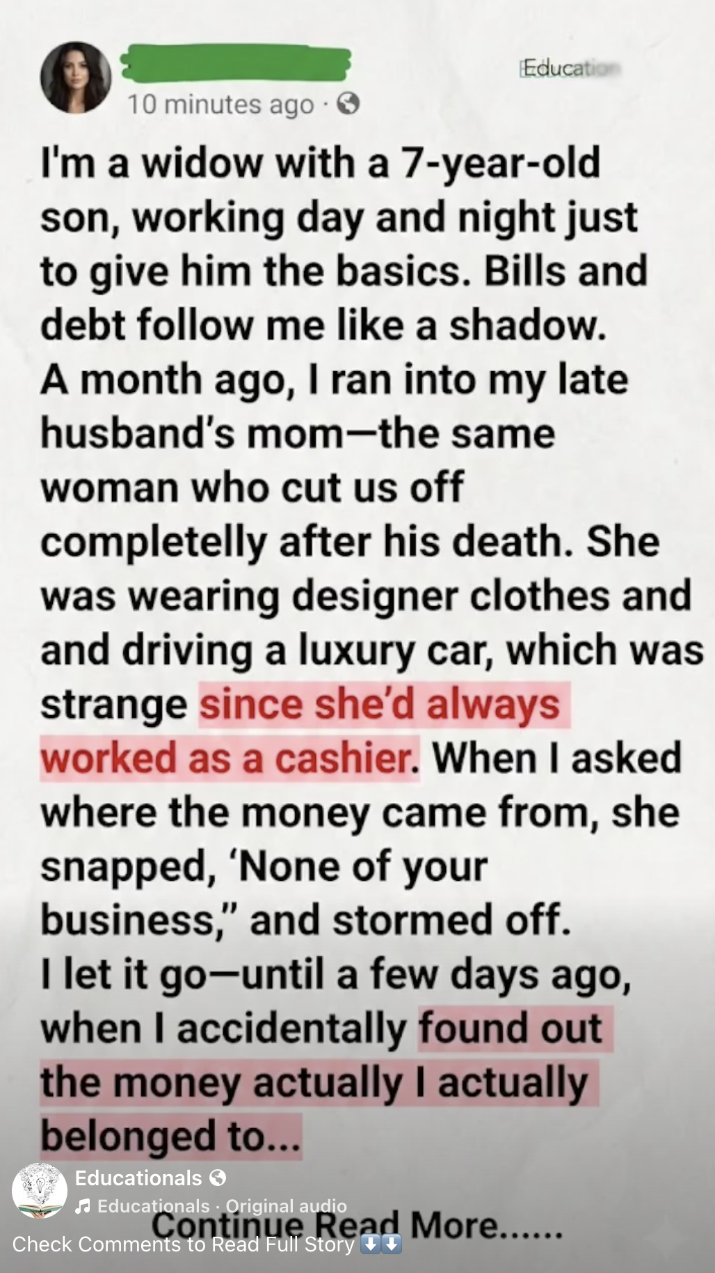 A month ago, I ran into my late husband’s mom—the same woman who cut us off completely after his death. I was walking out of a discount grocery store; she was walking out of a high-end boutique. She was wearing designer clothes and driving a luxury car, which was strange since she’d always worked as a cashier.