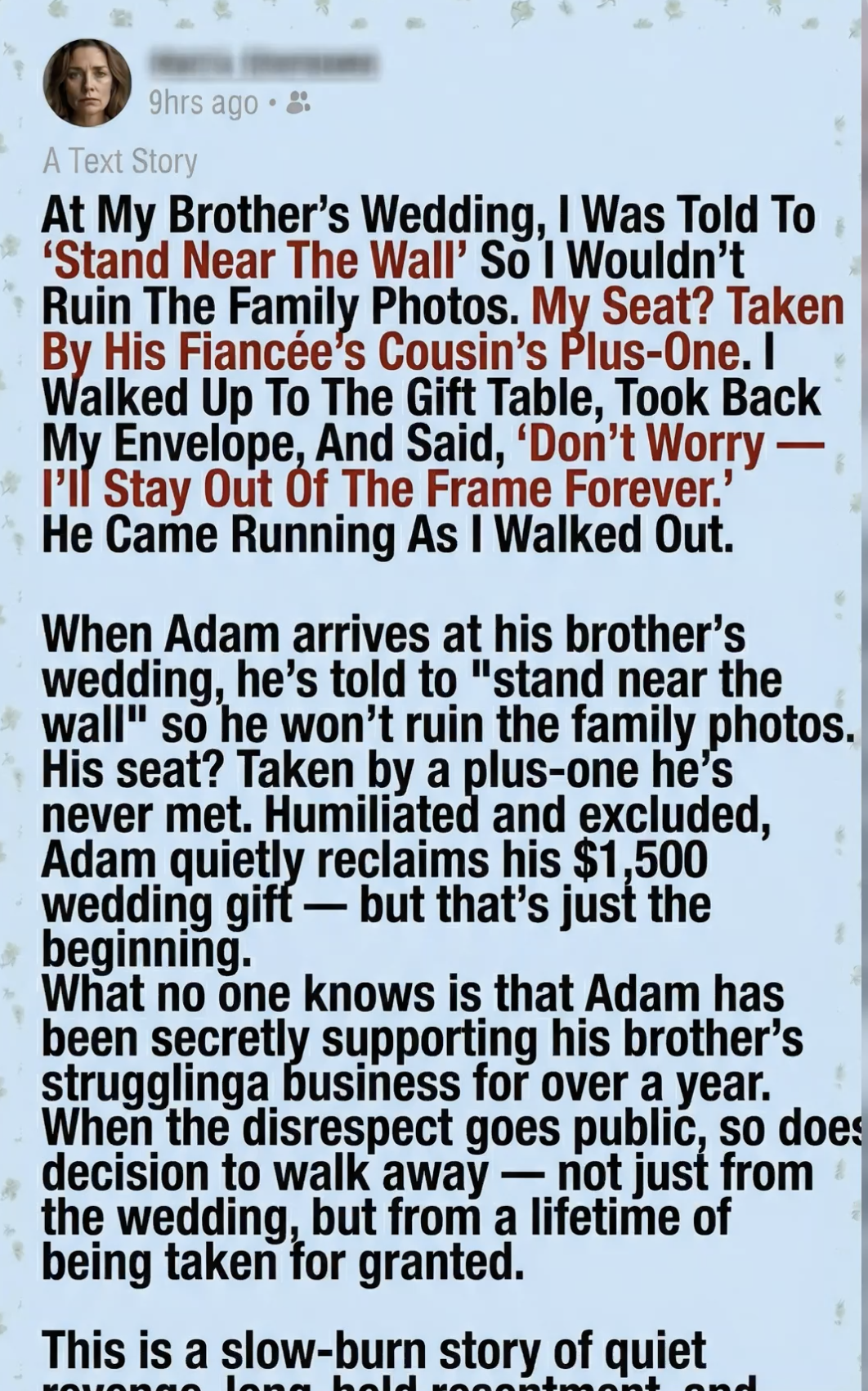 When Adam arrives at his brother’s wedding, he’s told to “stand near the wall” so he won’t ruin the family photos. His seat? Taken by a plus-one he’s never met. Humiliated and excluded, Adam quietly reclaims his $1,500 wedding gift — but that’s just the beginning. What no one knows is that Adam has been secretly supporting his brother’s struggling business for over a year. When the disrespect goes public, so does [his] decision to walk away — not just from the wedding, but from a lifetime of being taken for granted.