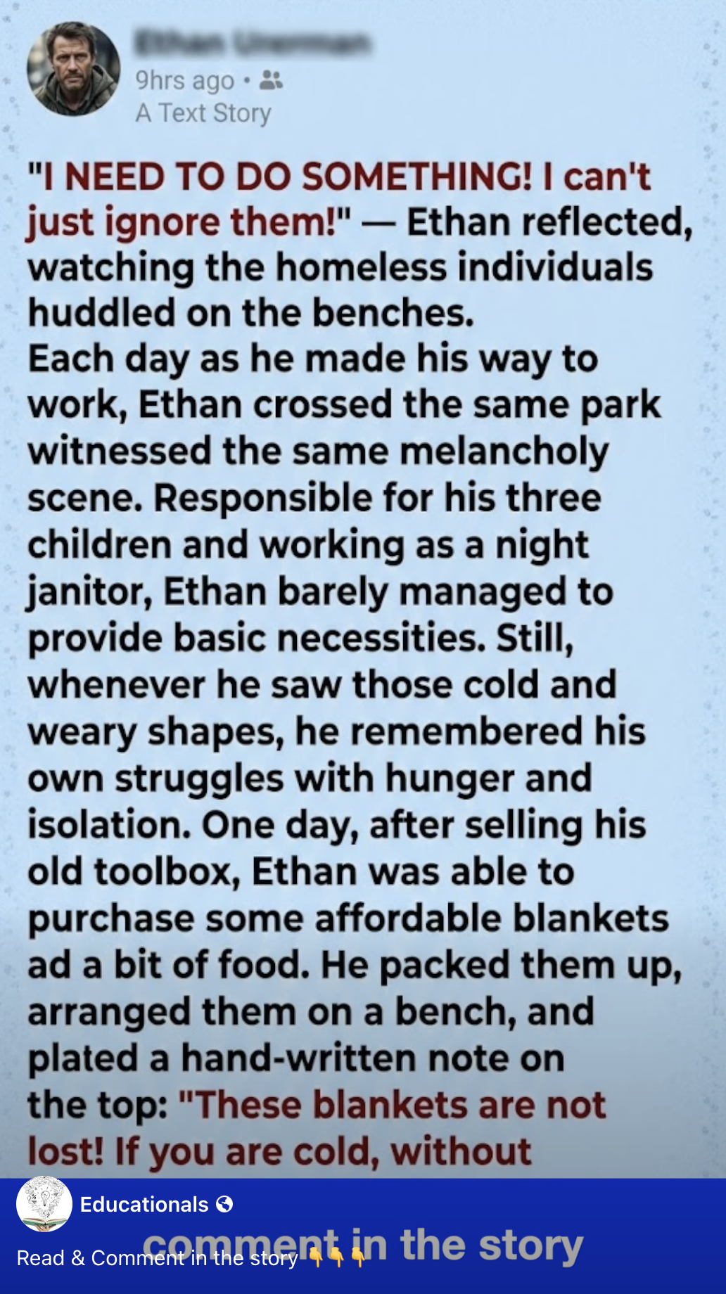 Responsible for his three children and working as a night janitor, Ethan barely managed to provide basic necessities. He knew the sting of poverty intimately. He often skipped meals so his kids could have seconds. Still, whenever he saw those cold and weary shapes, he remembered his own struggles with hunger and isolation.