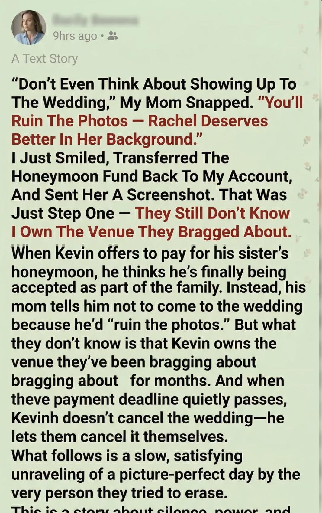“I’m afraid the owner agrees with you, Mom,” Kevin said, his voice as smooth as glass. “He thinks you deserve a better background for your photos. And since I’m too ‘ordinary’ to be in the pictures, I thought it was only fair that my building wasn’t in them either.”