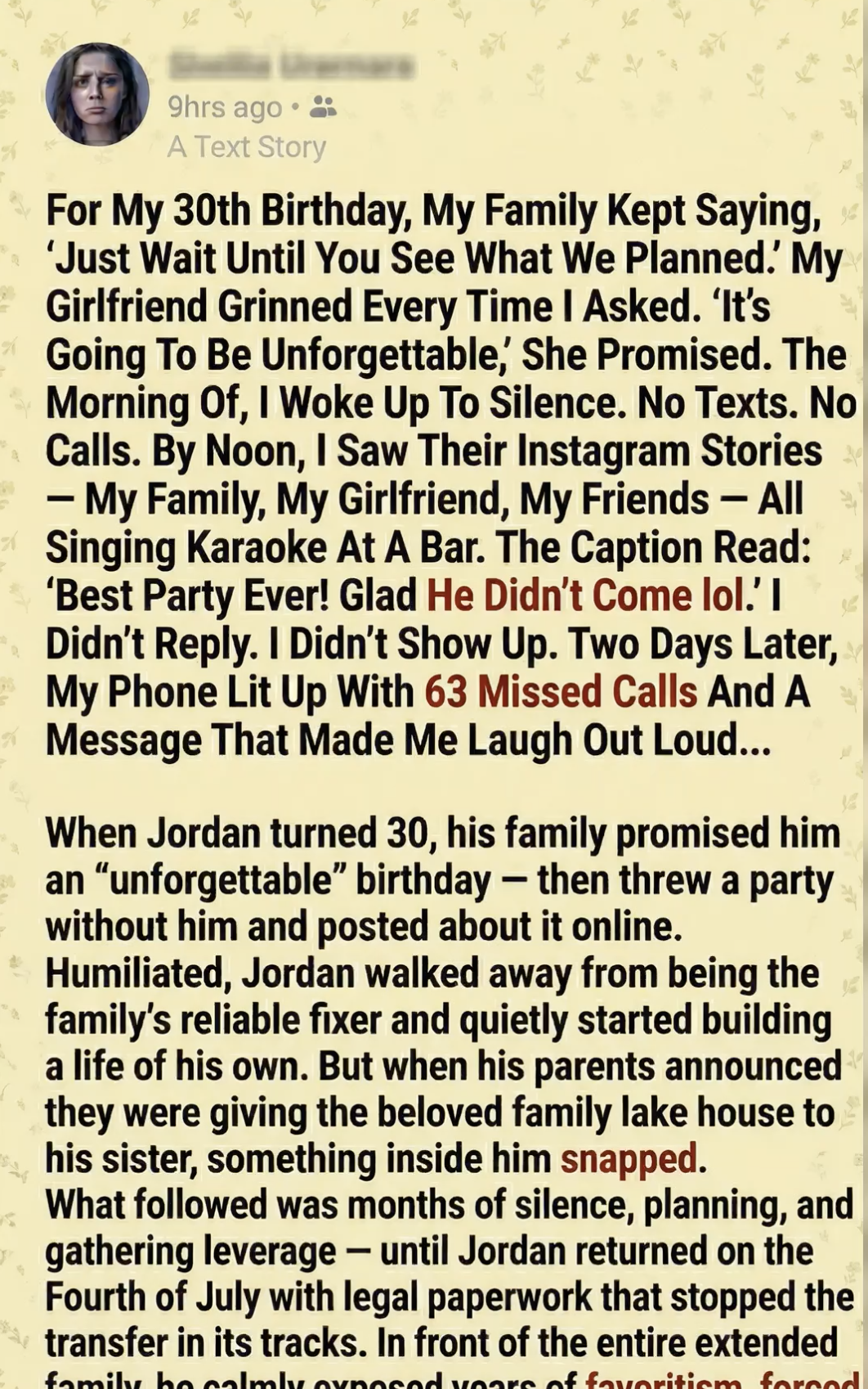 He saw them. All of them. His parents, his sister Megan, his best friend, and Chloe, all huddled around a karaoke machine at a downtown bar. They were wearing birthday hats. Megan was holding a shot glass, laughing. The caption, posted by Chloe herself, read: “Best Party Ever! Glad He Didn’t Come lol! #ThirtyAndThriving #PeaceAtLast.”