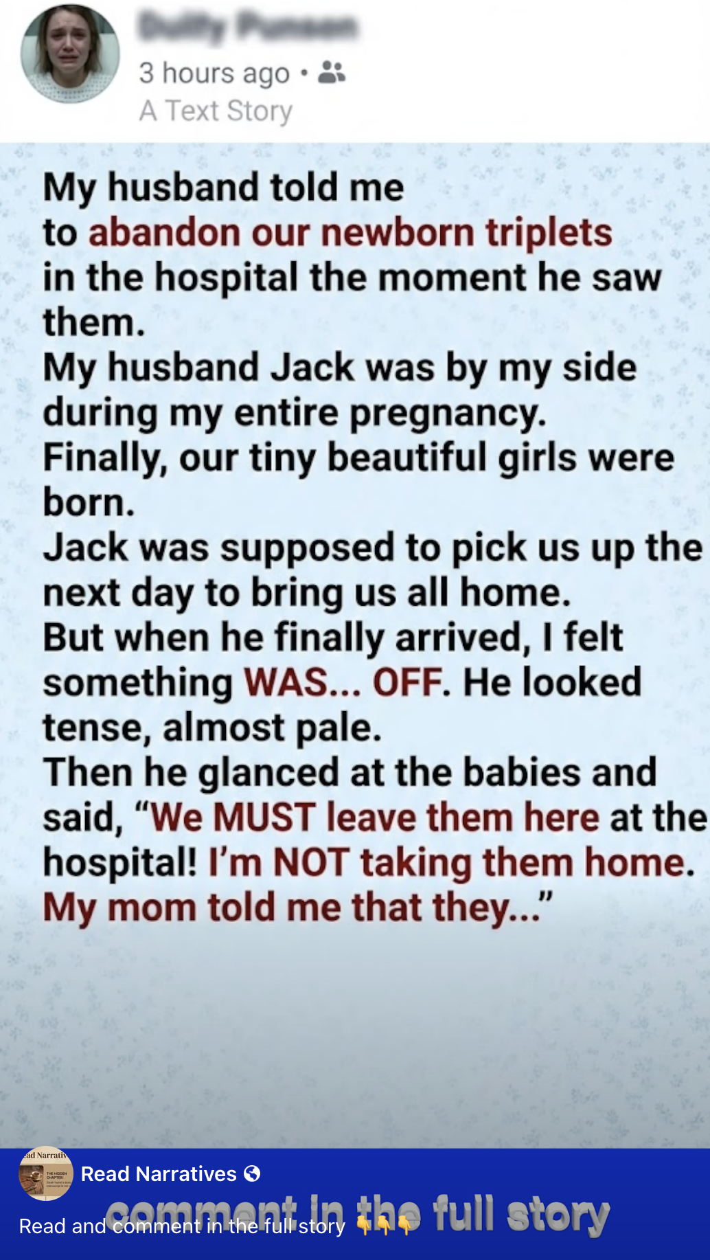 I arrived at the hospital near the venue to visit a sick relative, but I stumbled into a crisis in the hallway. A woman was weeping. “My husband told me to abandon our newborn triplets in the hospital the moment he saw them,” she cried. She explained that her husband, Jack, had been supportive until he spoke to his mother. “He glanced at the babies and said, ‘We MUST leave them here at the hospital! I’m NOT taking them home. My mom told me that they…'”.