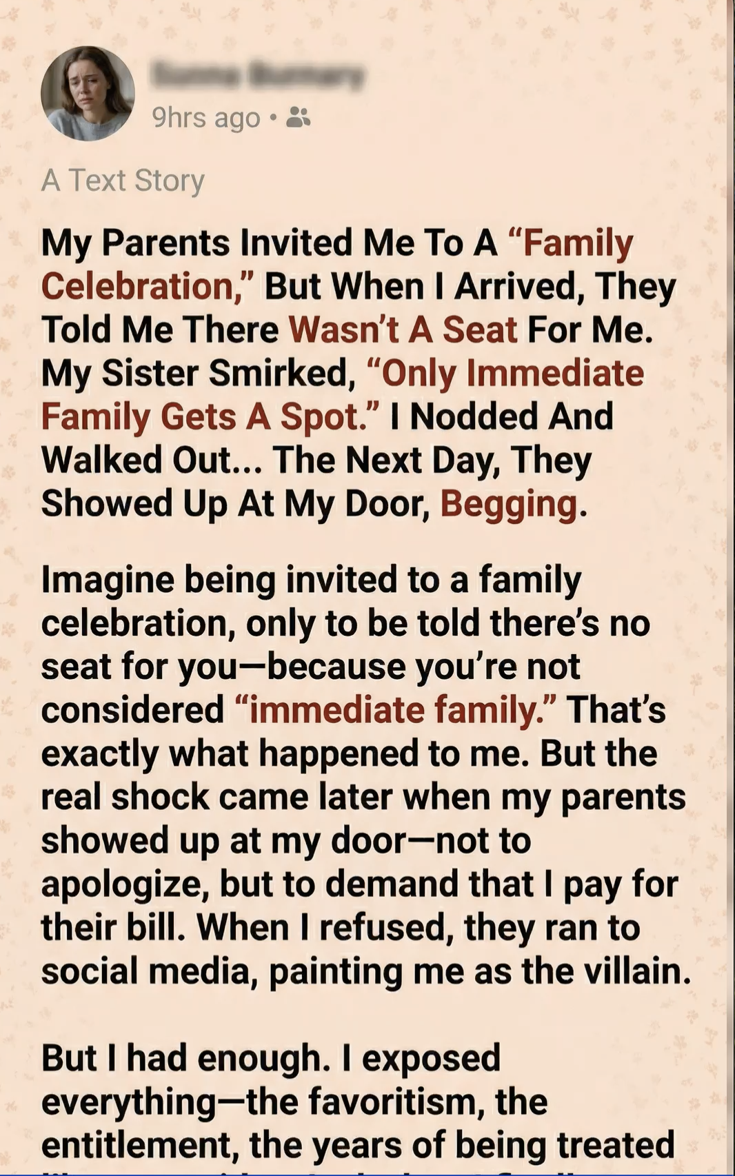 The twist: The “celebration” was an expensive dinner the parents assumed the narrator would pay for. When the bill arrived and the narrator wasn’t there to swipe their card, the parents and sister showed up at the narrator’s home—not to apologize, but to demand payment. When met with a “no,” the family took to social media to play the victim, prompting the narrator to drop a “truth bomb” exposing years of toxic favoritism.