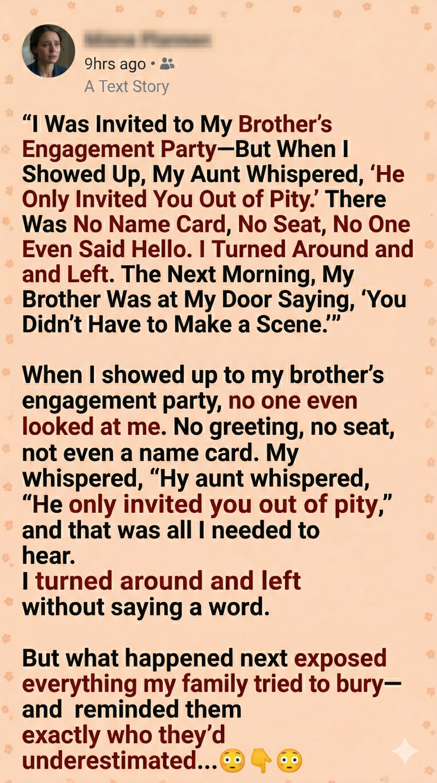I walked over to my desk and picked up a folder. “But last night, I realized I’ve been funding my own disappearance. If I’m a ‘pity invite’ at your engagement, I certainly shouldn’t be the guest of honor’s benefactor.”