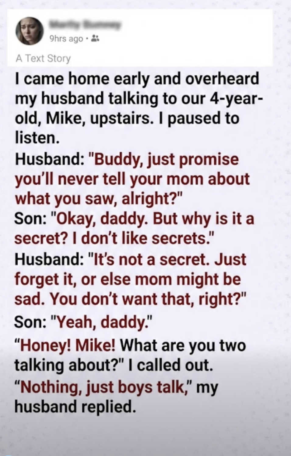 Husband: “Buddy, just promise you’ll never tell your mom about what you saw, alright?” Son: “Okay, daddy. But why is it a secret? I don’t like secrets.” Husband: “It’s not a secret. Just forget it, or else mom might be sad. You don’t want that, right?”