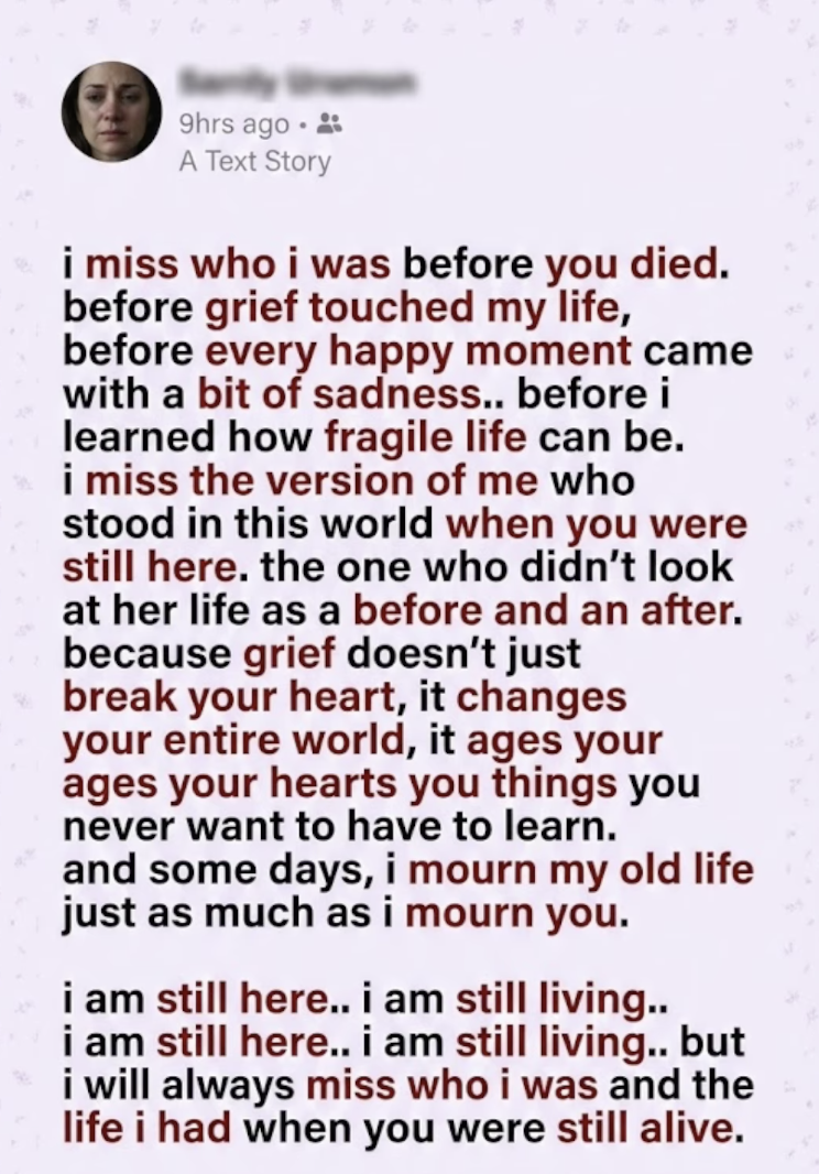 I sat there in the dark, watching that stranger on the screen, and I realized the hardest truth of all: I miss who I was before you died.