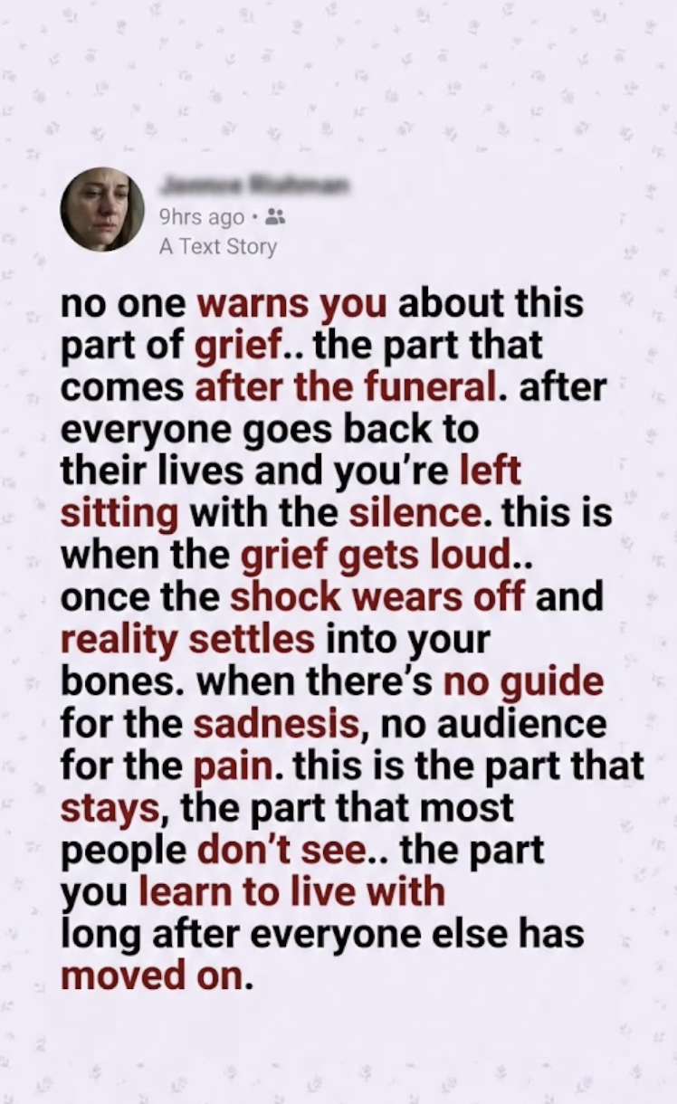 After everyone goes back to their lives, you realize with a jolt that you are the only one stuck in time. They have deadlines and dinner plans. And you’re left sitting with the silence.