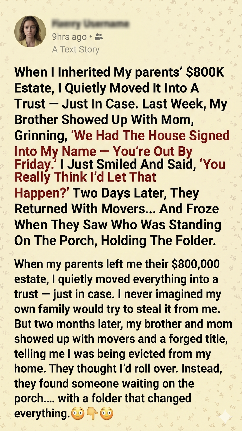 Last week, the front door swung open. My brother, Leo, walked in grinning, followed by Mom. He threw a “Title Deed” onto the coffee table. “Surprise, loser. Mom and I went to the city archives. We had the house signed into my name through the ‘line of succession’ clause. You’re out by Friday. Maddie needs a place to launch her ‘influencer’ career.”