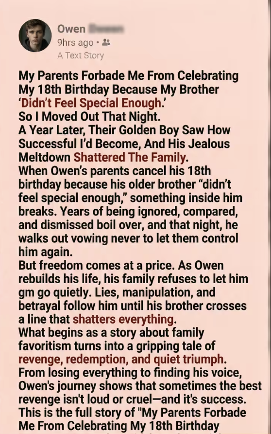The 18th birthday was supposed to be Owen’s one day. He had saved money from a part-time job to host a small dinner for his friends. But two hours before the event, his mother took the decorations down.