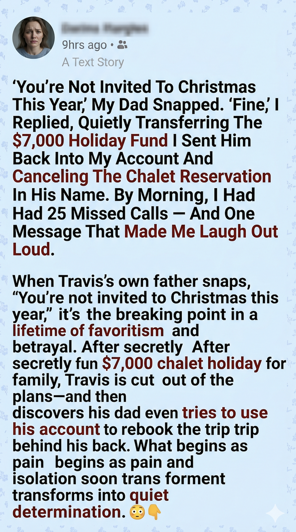 But during a heated argument over my younger brother’s latest legal fees—which I refused to pay—my dad snapped. “You’ve always been a cold, selfish person, Travis! You know what? You’re not invited to the chalet. We don’t want your energy there. Don’t show up for Christmas.”