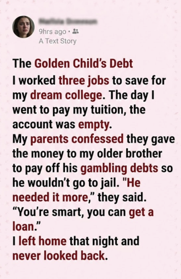 For three years, my life had been a blur of grease, textbooks, and caffeine. I worked the opening shift at a coffee shop from 5 AM to 1 PM, went to classes, and then stocked shelves at the grocery store until midnight. On weekends, I tutored rich kids for cash. I had worked three jobs to save for my dream college. Every dollar I earned went into the joint savings account my mother had opened for me “for safekeeping.”