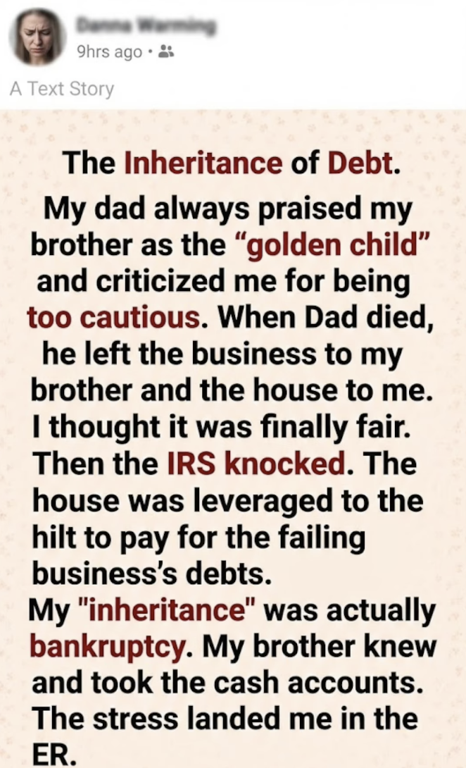 My knees hit the floor. My “inheritance” was actually bankruptcy. Dad hadn’t given me a home; he had given me his debt so his golden boy could walk away debt-free. My brother knew and took the cash accounts, leaving me to hold the bag for their failures.