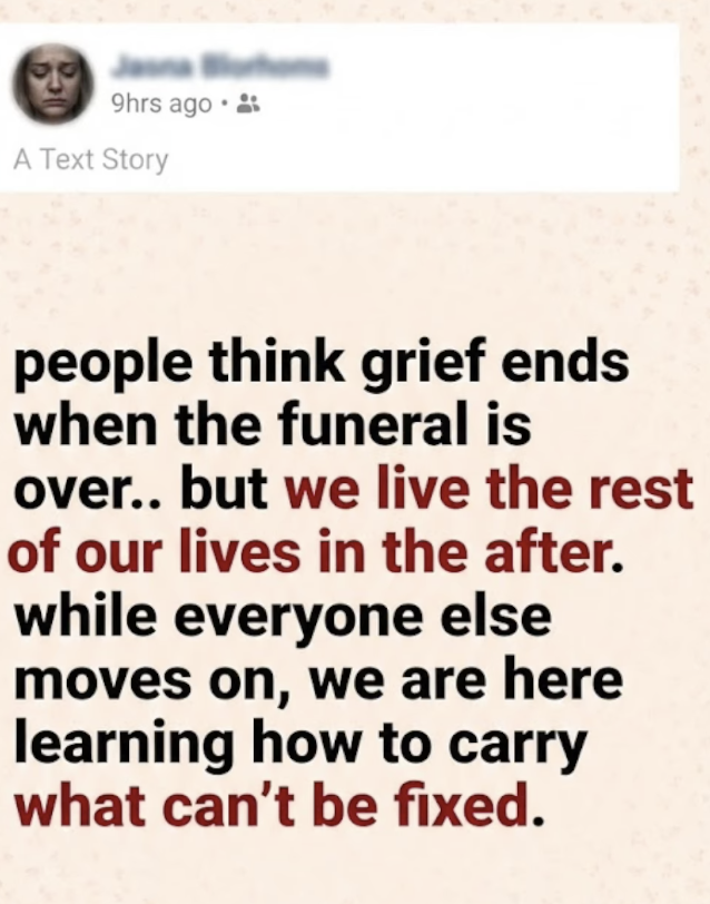 But inside, the disconnect was deafening. She wanted to grab Claire’s hand and explain that people think grief ends when the funeral is over. They think grief is an event, a flu you get over, or a season that passes.