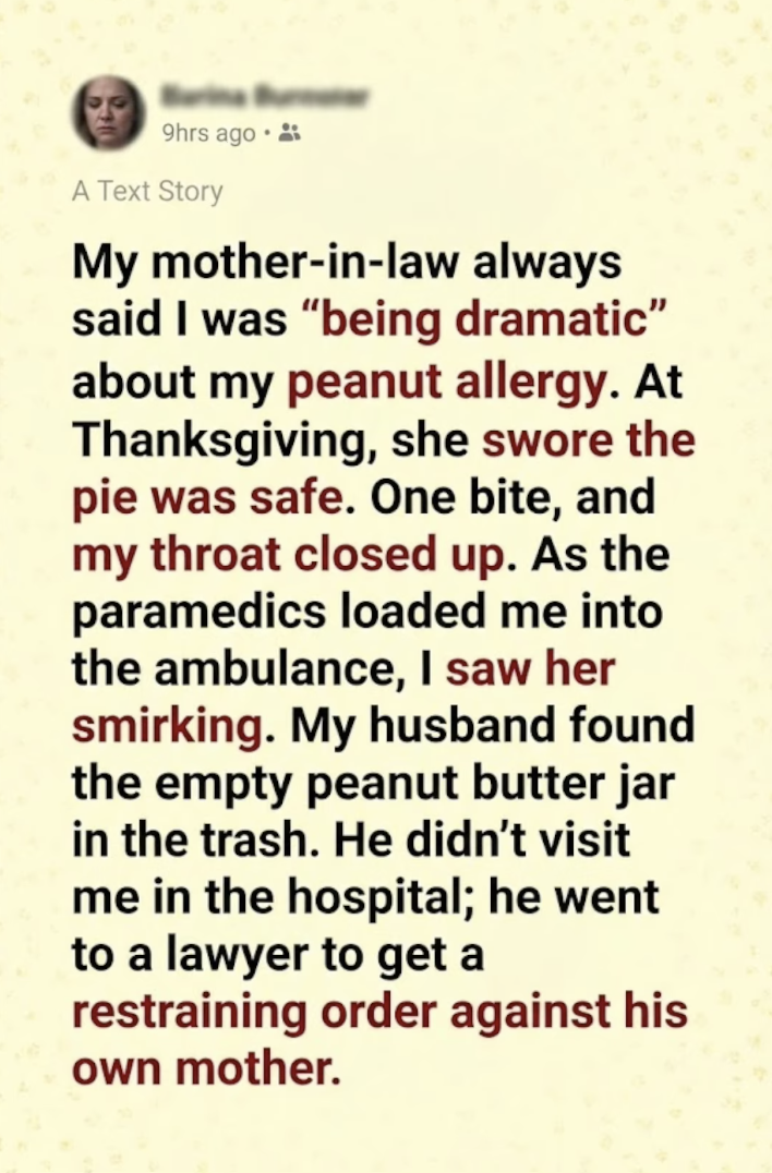 “Oh, loosen up, Jenna,” Barbara would say, waving a spoon covered in unknown sauce. “My mother-in-law always said I was ‘being dramatic’ about my peanut allergy“. She treated my EpiPen like a prop and my medical condition like a personality quirk designed to annoy her.