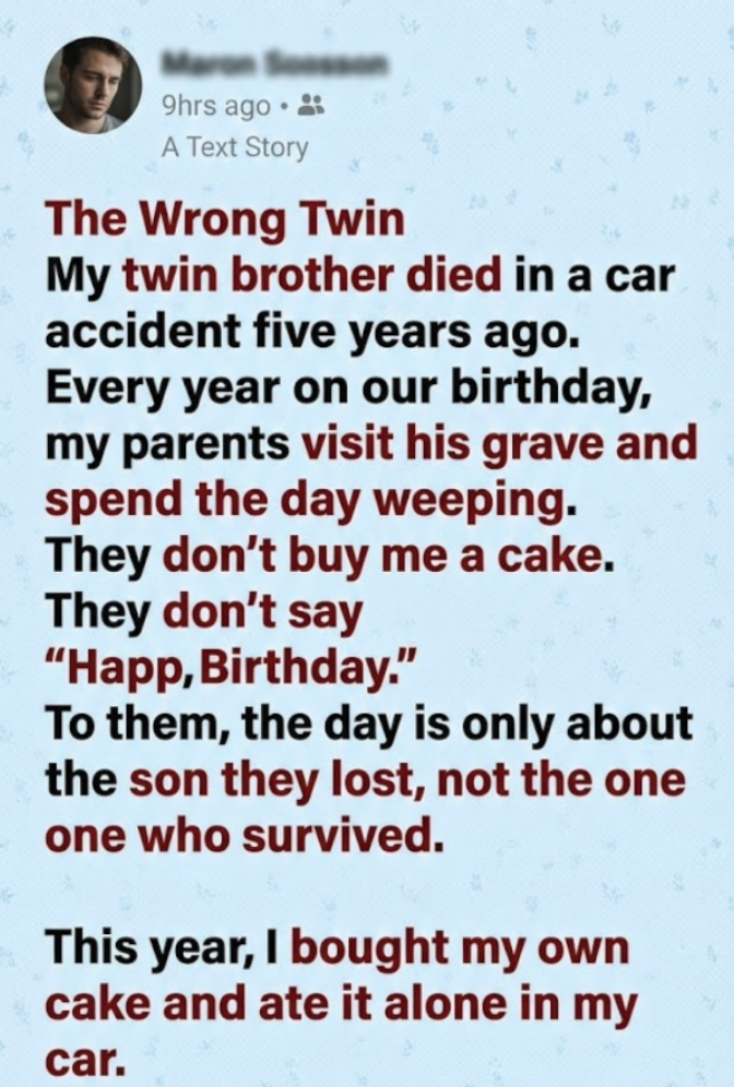 I walked to the mirror in the hallway. I looked like him. I sounded like him. But I wasn’t him. To them, the day is only about the son they lost, not the one who survived. I was just the spare tire, the reminder of the tragedy, the wrong twin.
