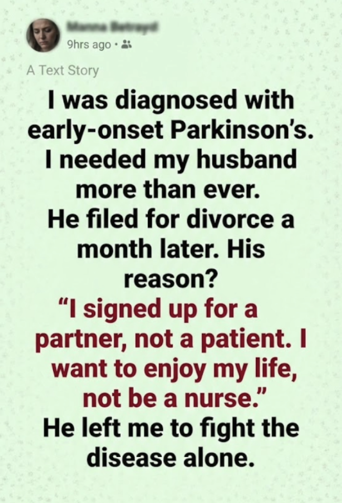 The neurologist’s office was cold and smelled of antiseptic. Dr. Aris didn’t sugarcoat it. “I was diagnosed with early-onset Parkinson’s,” he said gently, handing me a pamphlet that felt heavy as a brick. I was thirty-four.