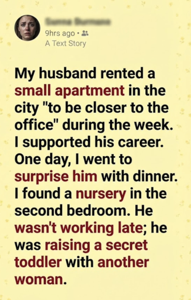 “My husband rented a small apartment in the city ‘to be closer to the office’ during the week,” I told my friends proudly. I painted it as a strategic move, a sacrifice we were both making for our future.