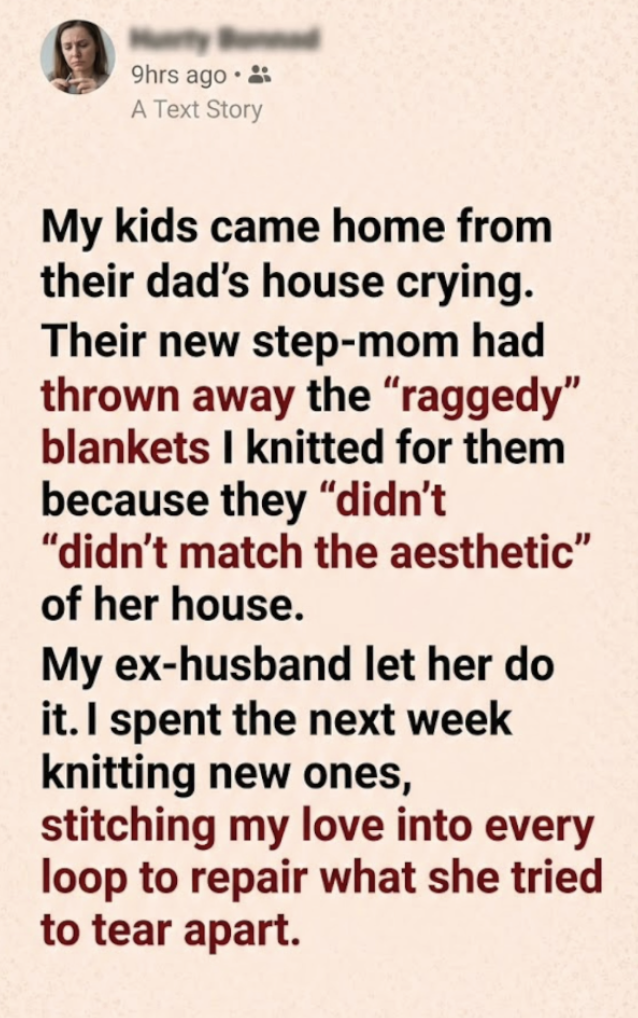 The blankets weren’t masterpieces. I’ll admit that. One was a lopsided blue with a dropped stitch in the corner; the other was a yellow that had faded to the color of old butter. But they were soft, they smelled like lavender detergent, and they were the only things my children, Leo and Mia, refused to sleep without.