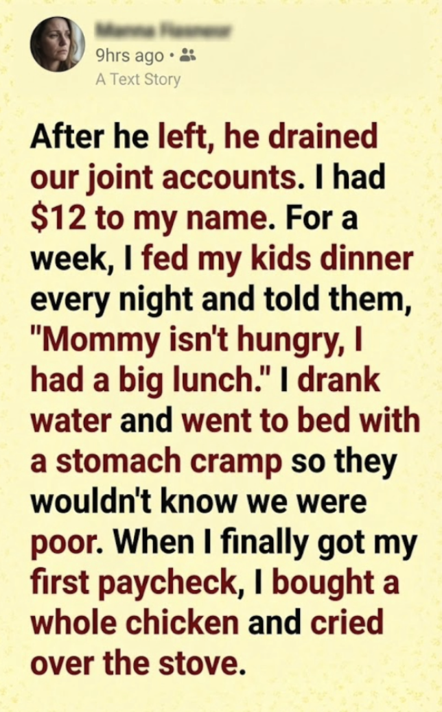 I sat on the kitchen floor and hyperventilated. Twelve dollars. A loaf of bread, a gallon of milk, maybe a carton of eggs. That was supposed to last us until my new job’s payroll processed in seven days.