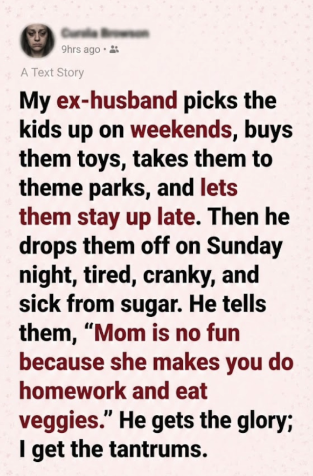 He looked fresh, energized, the picture of the “Fun Dad.” My ex-husband picks the kids up on weekends, buys them toys, and takes them to theme parks. He gets to be the event coordinator of their lives, the man who exists solely to facilitate joy.