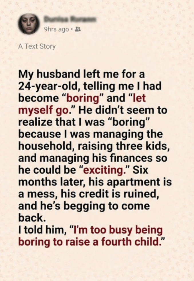 He didn’t seem to realize that I was ‘boring’ because I was managing the household, raising three kids, and managing his finances so he could be ‘exciting.’.