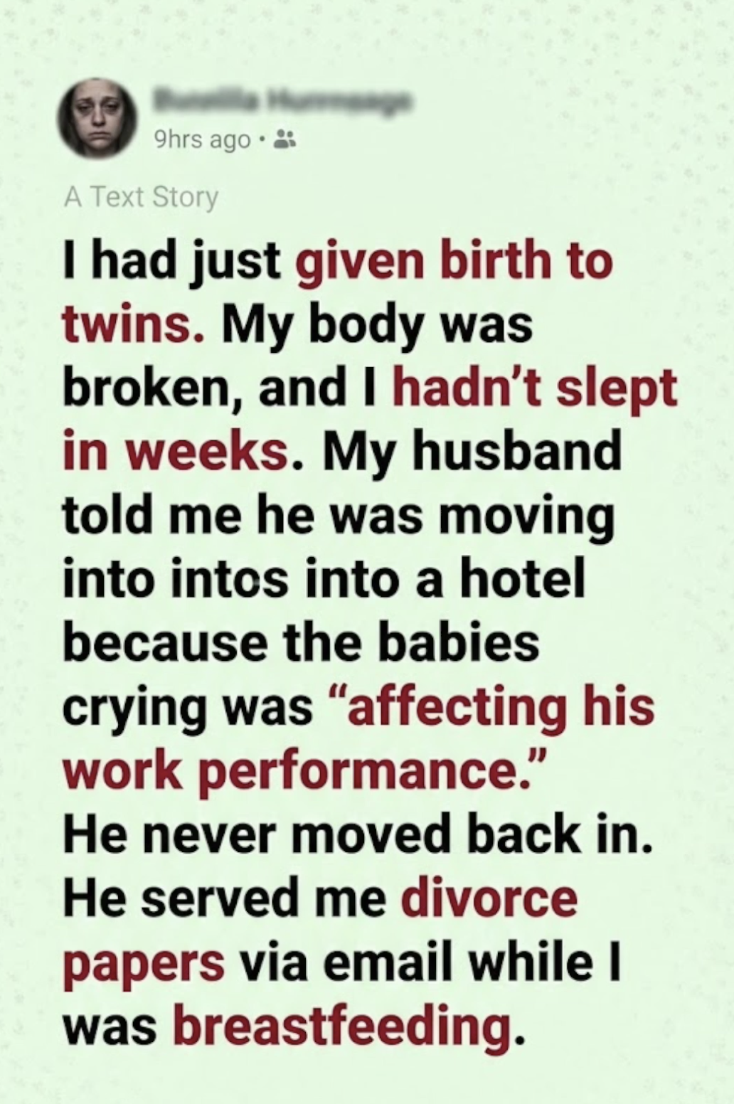 I sat there, tethered to our children by biology and love, reading the legal declaration that he was done. He hadn’t just checked out of the house; he had checked out of the family. He chose his “work performance” over the hardest job in the world. As I looked down at the two sleeping faces against my chest, I realized he had done us a favor. He had removed the biggest baby from the house, leaving me with the only two that actually mattered.