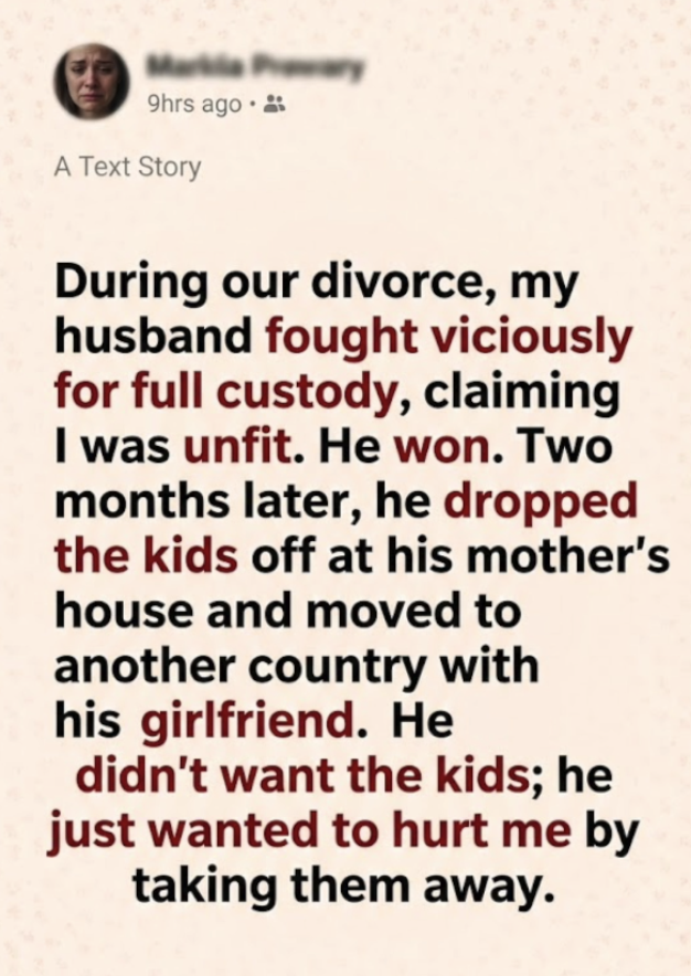 My husband fought viciously for full custody, claiming I was unfit. He brought up every mistake I had ever made. He twisted my anxiety into insanity. He turned my late nights at work into neglect. He put on the performance of a lifetime, convincing the court that he was the only stable parent.