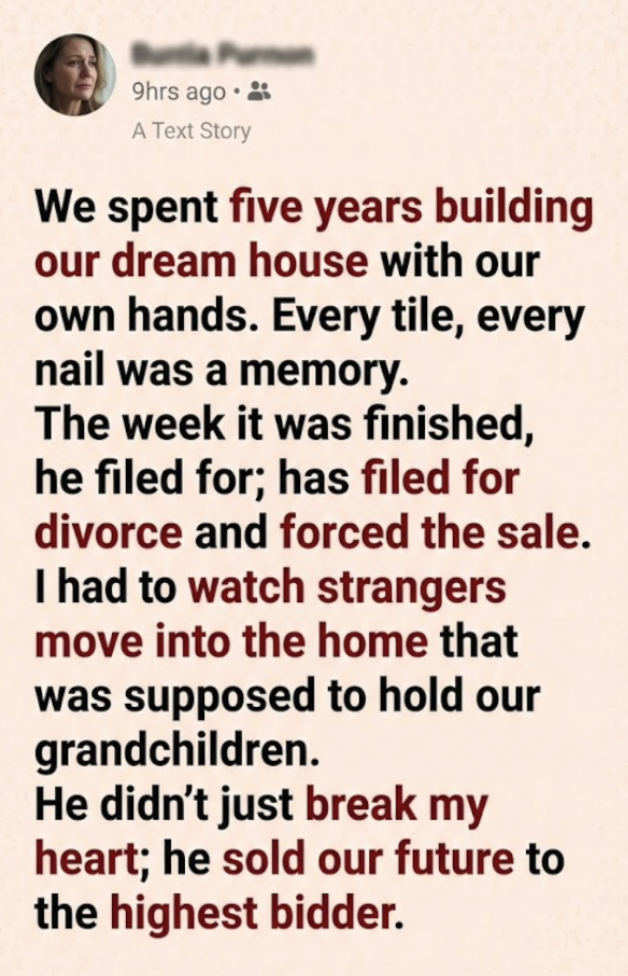 The world stopped. He hadn’t waited until the foundation was poured. He hadn’t left when the framing was up. He waited until the value was maximized. The week it was finished, he filed for divorce and forced the sale.