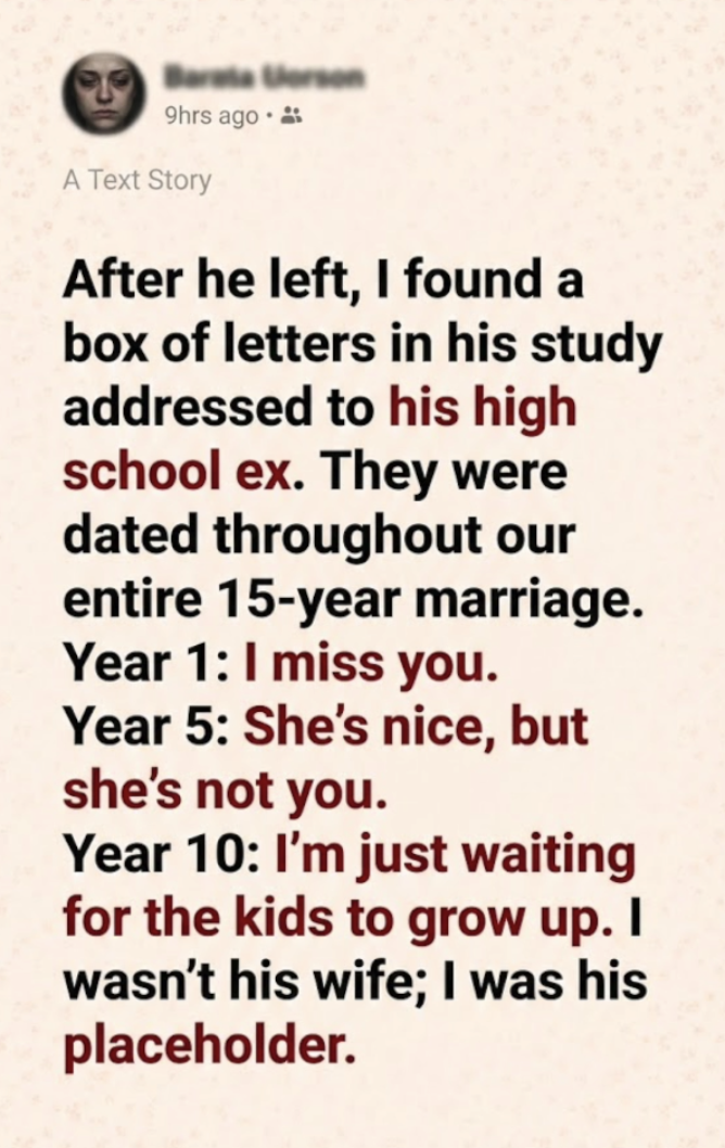 I wasn’t his wife; I was his placeholder. I was the intermission between the prologue of his youth and the third act he had planned with her all along. And the tragedy wasn’t that he left; it was that he had never really arrived.