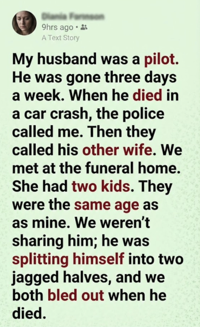 And standing there, watching our confused children look at their siblings-strangers, I knew the truth. He didn’t die in the crash. The crash just stopped the juggling act. The real tragedy was that we both bled out when he died, left to stitch up the wounds of a life that was only ever half-true.