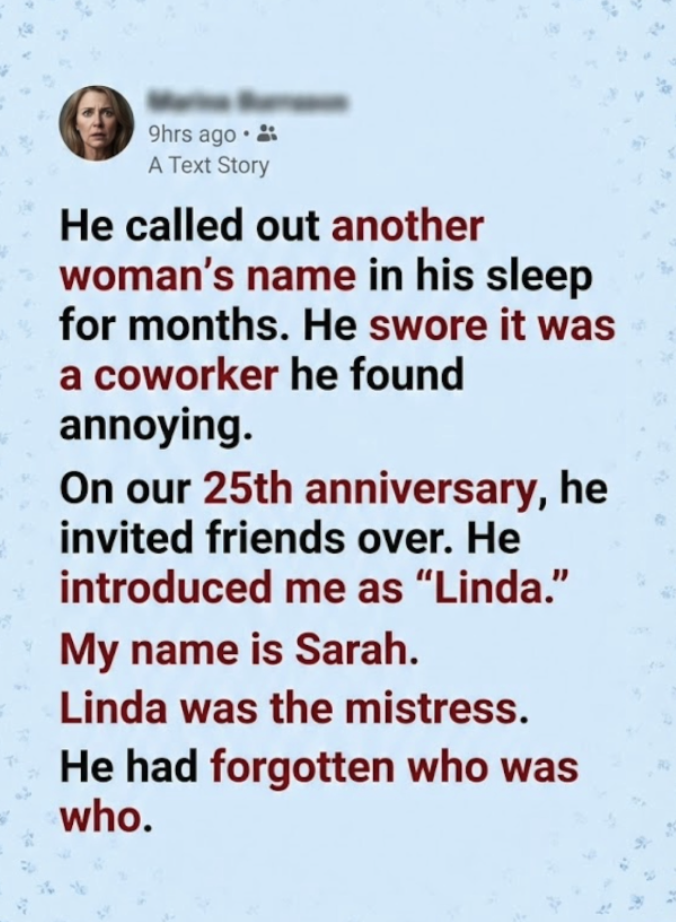 “It’s just work, Sarah,” he insisted. “He swore it was a coworker he found annoying.“. He claimed she was incompetence personified, a woman who messed up spreadsheets and haunted his stress dreams. I wanted to believe him. After twenty-five years, you want to believe the man sleeping next to you isn’t dreaming of someone else. So, he called out another woman’s name in his sleep for months, and I let it go.
