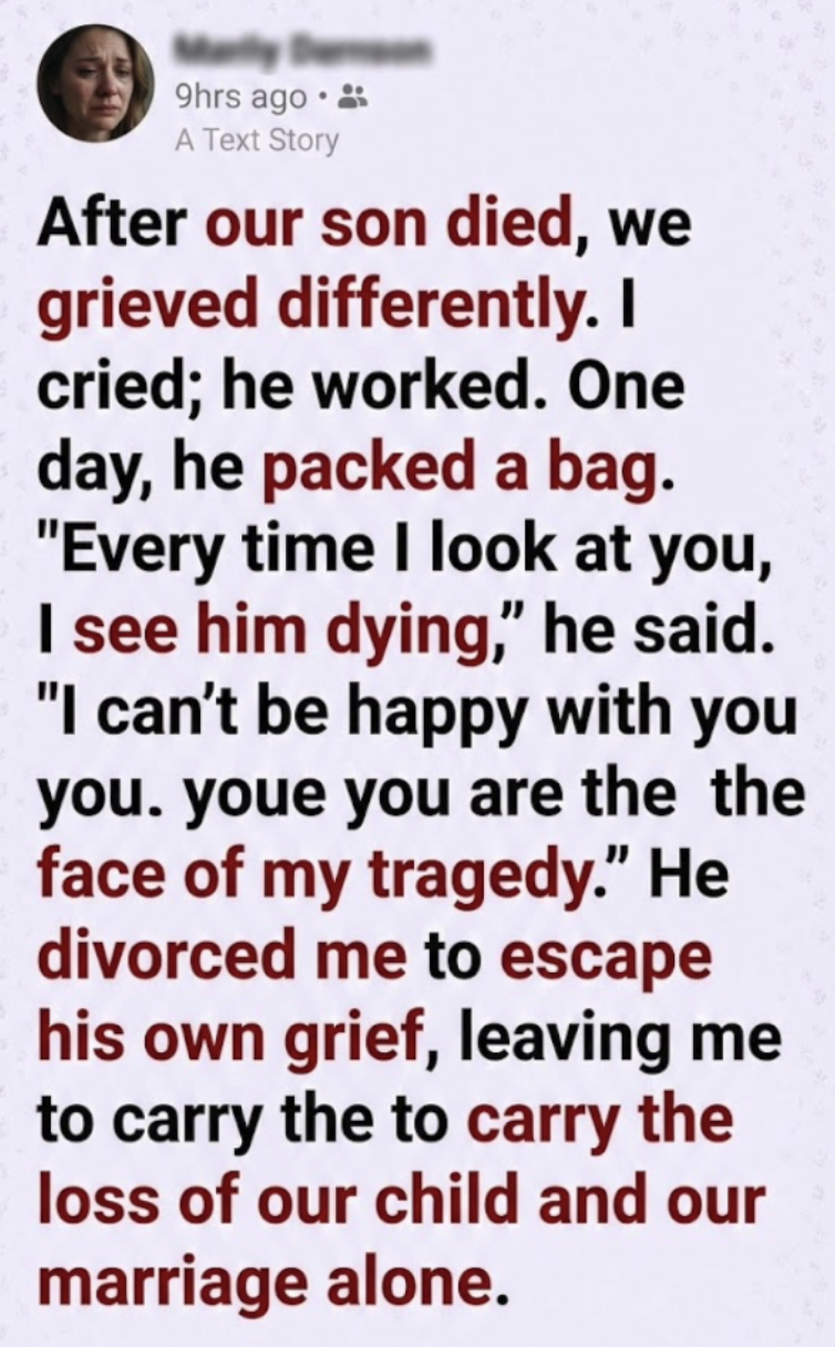 He picked up his bag. He walked out the door, seeking a world where he could pretend the nightmare hadn’t happened. He divorced me to escape his own grief.