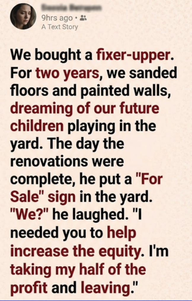 He walked past me back into the house—the house I had poured my sweat and soul into. I realized with sickening clarity that I hadn’t been building a life; I had been working an unpaid internship for his exit strategy. He had flipped the house, and he had flipped me right along with it.