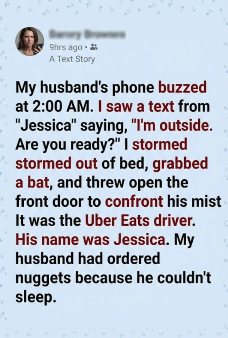 He looked at the driver, then at the bat, then at me. “My husband had ordered nuggets because he couldn’t sleep,” and he simply forgot to mention that our midnight rendezvous was with a deep fryer, not a homewrecker.