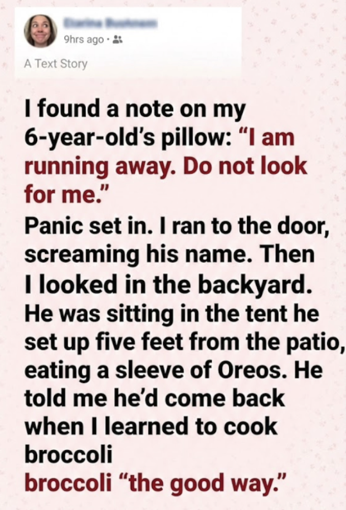 I found a note on my 6-year-old’s pillow: “I am running away. Do not look for me.”.