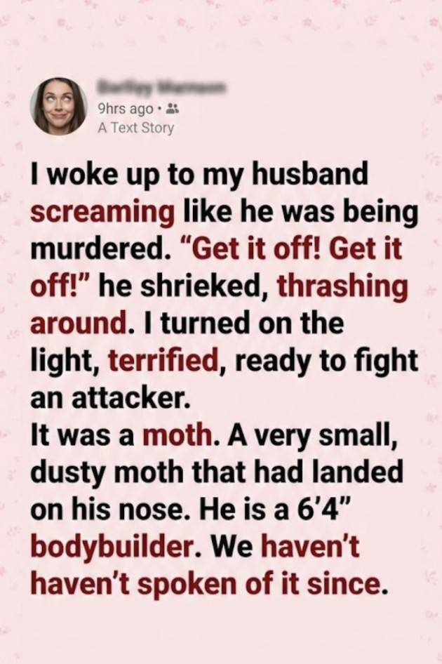 I looked at the speck. Then I looked at my husband. He was pressed against the headboard, breathing like he had just run a marathon, clutching a pillow to his massive chest.